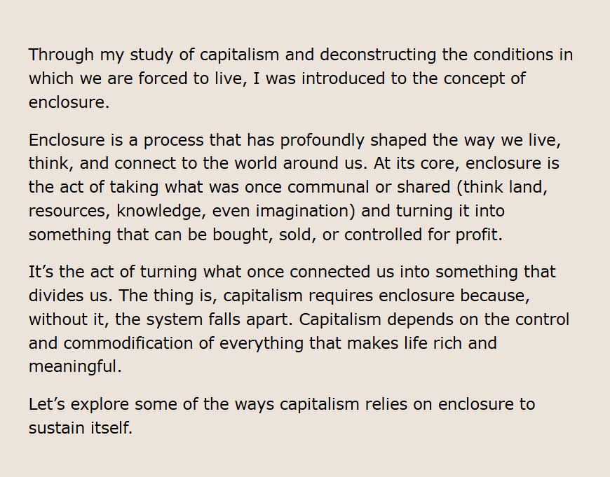 Enclosure can suggest we have to monetize every last one of our talents and thoughts, turn every last one of our arts into an income stream, and make everything we say or do related to running a business, churning content, or AI slop.