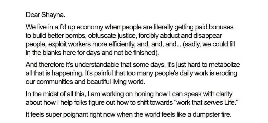 Dear Shayna, thank you so much for referencing our work together, but mostly, thank you for sharing this. I know that so many people are feeling the same thing as you and I know how much this is going to resonate. I fully believe in the power of the work you do in helping us all share out gifts at a time when the world desperately needs them.